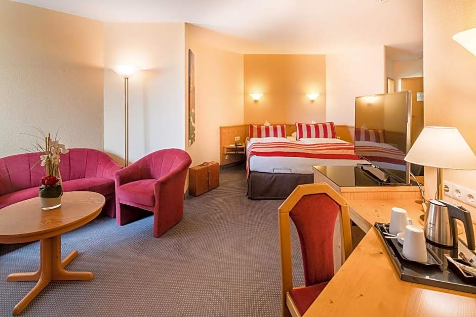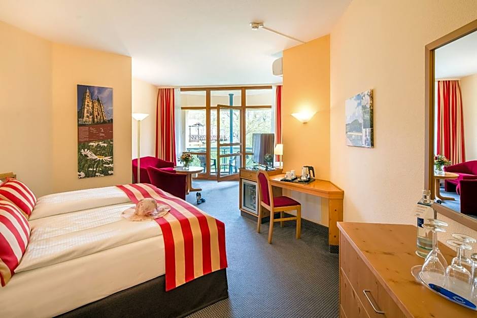 This south-facing and bright single room features a seating area, a working desk and a balcony with a view of the Obermain Thermal Bath.